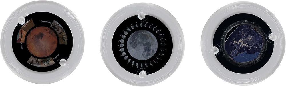 Rozšiřte možnosti vašeho Buki planetária (model 8002) s touto sadou náhradních disků! Tento set obsahuje tři nové disky, které obohatí vaši oblohu o nové fascinující pohledy na vesmír. Objevte krásy Měsíce, jeho fáze, krátery a moře, nebo se podívejte na úchvatné satelitní snímky Evropy z vesmíru. Nezapomeňte ani na Mars a jeho roboty, kteří se vydali na průzkum této tajemné planety.
