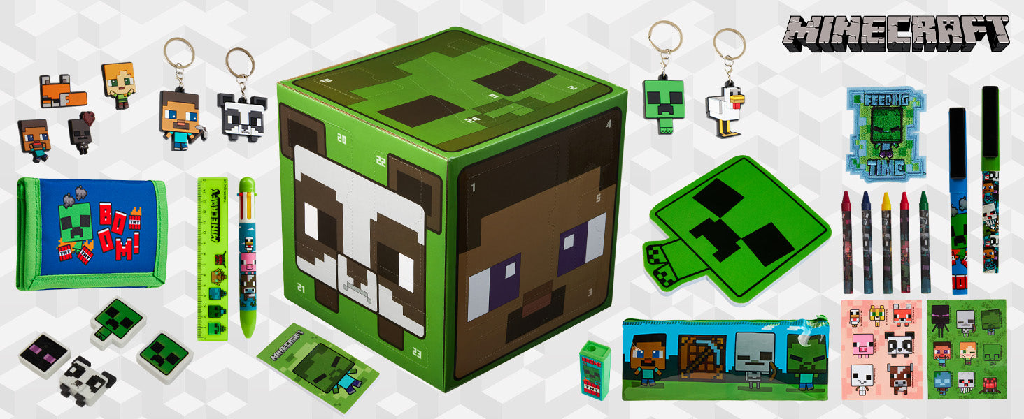 Za 24 dvířky na vás čekají školní potřeby a drobné doplňky s ikonickým motivem Creepera a dalších postav Minecraftu, například: