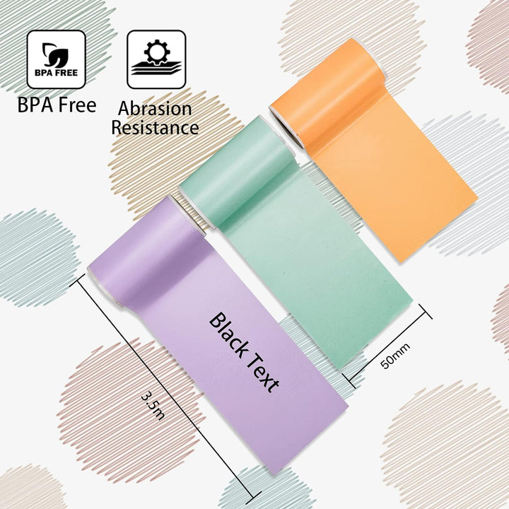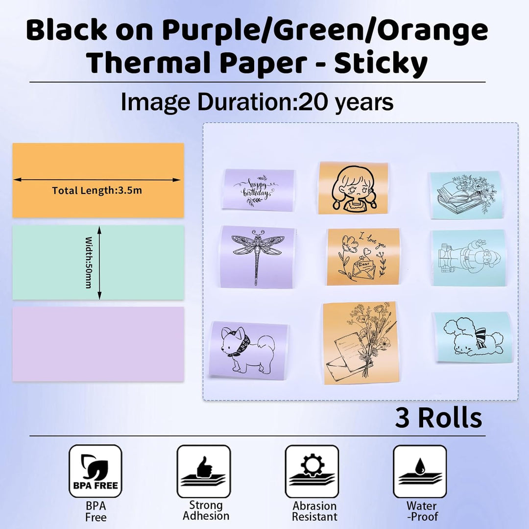 Balení obsahuje 3 kusy samolepících barevných štítků (fialová, zelená, oranžová), určených do tiskárny Phomemo T02. Každý papírový štítek je dlouhý 3,5 m, takže celé balení dostatečně vydrží i na několik týdnů tisknutí při pravidelném používání. Šířka štítku je 53 mm, ideální rozměr pro tisk poznámek, nálepek, fotek, QR kódů a dalších tištěných materiálů.