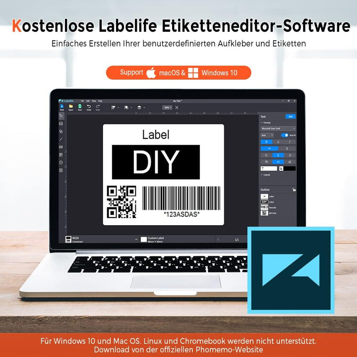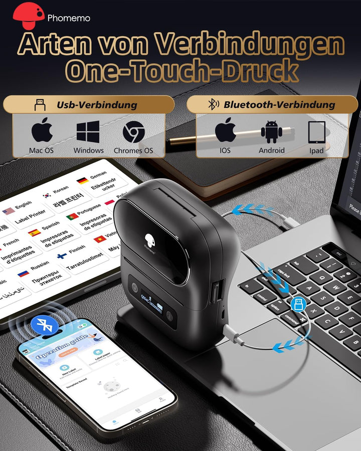 Tiskárna podporuje Bluetooth pro snadné propojení se zařízeními iOS a Android prostřednictvím mobilní aplikace. Pro práci na počítači lze využít USB připojení, které je kompatibilní se systémy Windows a MacOS. Tiskárna je tak vhodná pro širokou škálu uživatelů od jednotlivců až po podnikatele.