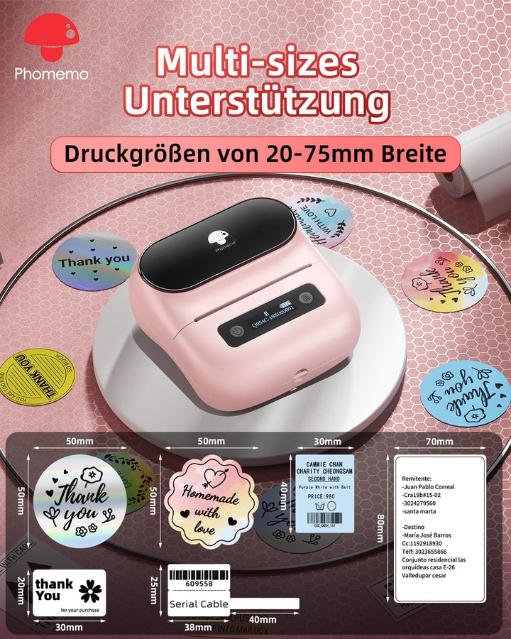Phomemo M220 podporuje tisk štítků o šířce 20–75 mm, což umožňuje široké spektrum využití – od adresních štítků, cenovek, čárových kódů a přepravních štítků až po označování produktů v obchodech nebo etiketování ve skladech. Perfektní řešení pro e-shopy, maloobchod, logistiku i domácí organizaci.