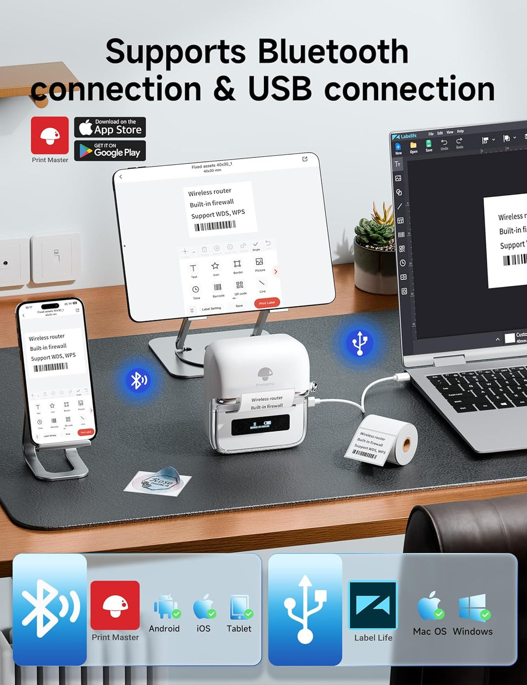 Tiskněte odkudkoli – připojte tiskárnu jednoduše přes Bluetooth k telefonu, tabletu nebo iPadu (Android, iOS, macOS), nebo ji propojte přes USB s počítačem.