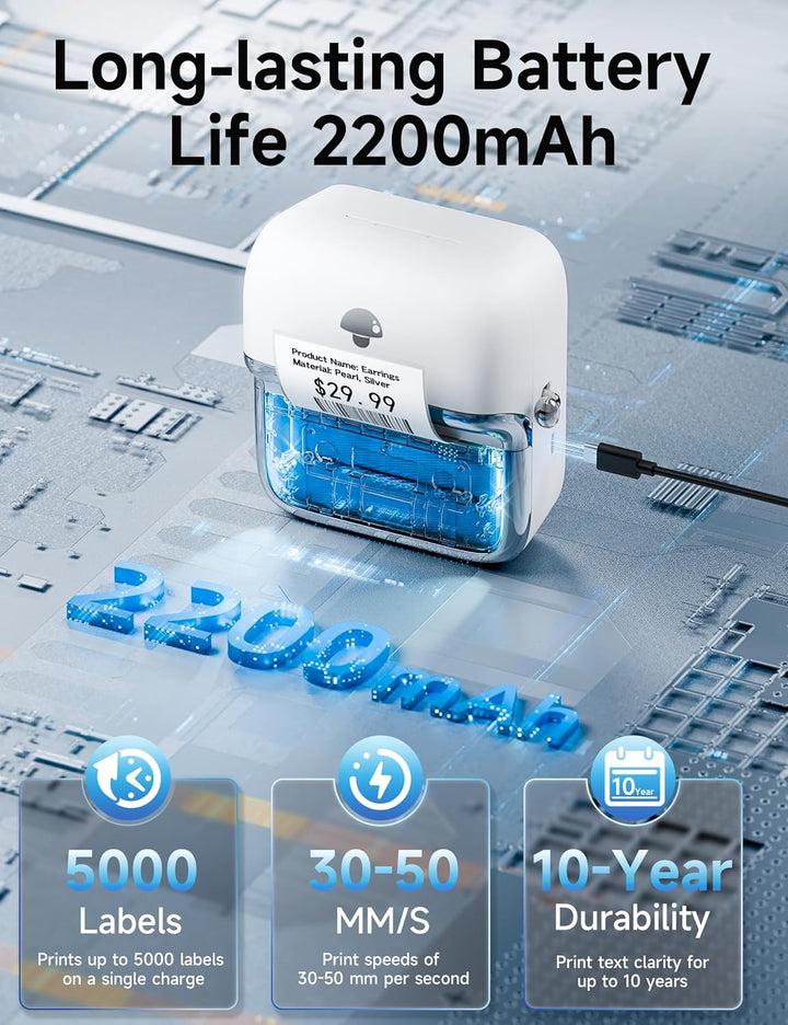 Vytiskněte až 5000 štítků na jediné nabití – ideální pro dlouhý den v kanceláři, obchodě nebo na cestách. Tiskárna je navíc vybavena chytrým úsporným režimem, který se automaticky aktivuje po 5 minutách nečinnosti a šetří tak baterii i životní prostředí.