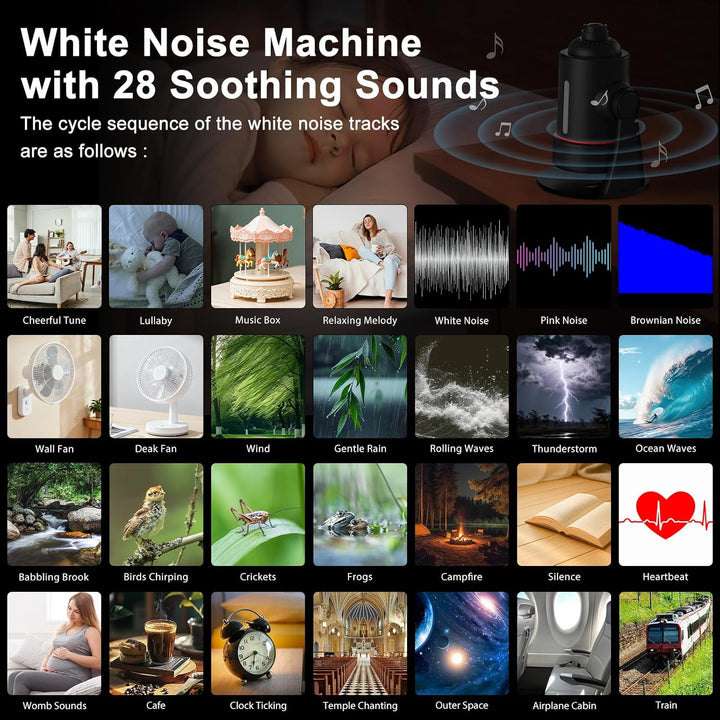 Vybrat si můžete z celé škály uklidňujících zvuků – od jemného deště a oceánských vln, přes bílý šum a zpěv ptáků, až po praskání táborového ohně, dunění vlaku či něžné ukolébavky.
