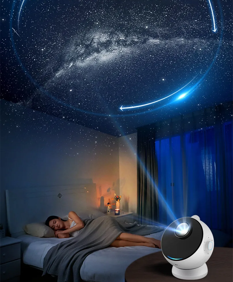 Projektor galaxie vytváří projekci galaxií, planet, hvězd a vesmírných mlhovin. Projektor může pomoci dětem i dospělým rozšířit znalosti a povědomí o existenci vesmíru. Tento projektor galaxie je unikátní svým futuristickým vzhledem, kvalitou a zejména speciální funkcí, která při projekci kosmických těles umožňuje spustit simulaci padající hvězdy. Tato speciální funkce dokáže při projekci vytvořit skutečné prostředí vesmíru a maximalizuje tak váš prožitek. Projektor funguje pomocí 12-ti kazet, které se jednotlivě zasouvají dovnitř projektoru. Poté se pomocí spouštěcího tlačítka aktivuje a tím spustit projekci.