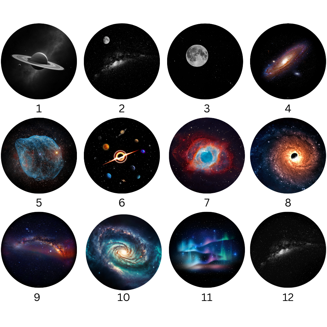 12 vyměnitelných kazet/disků: Planetárium nabízí řadu disků, které lze vložit přímo do projektoru a promítat tak realistické obrazy galaxií, planet a hvězd. Všechny snímky jsou založené na skutečných teleskopických fotografiích.