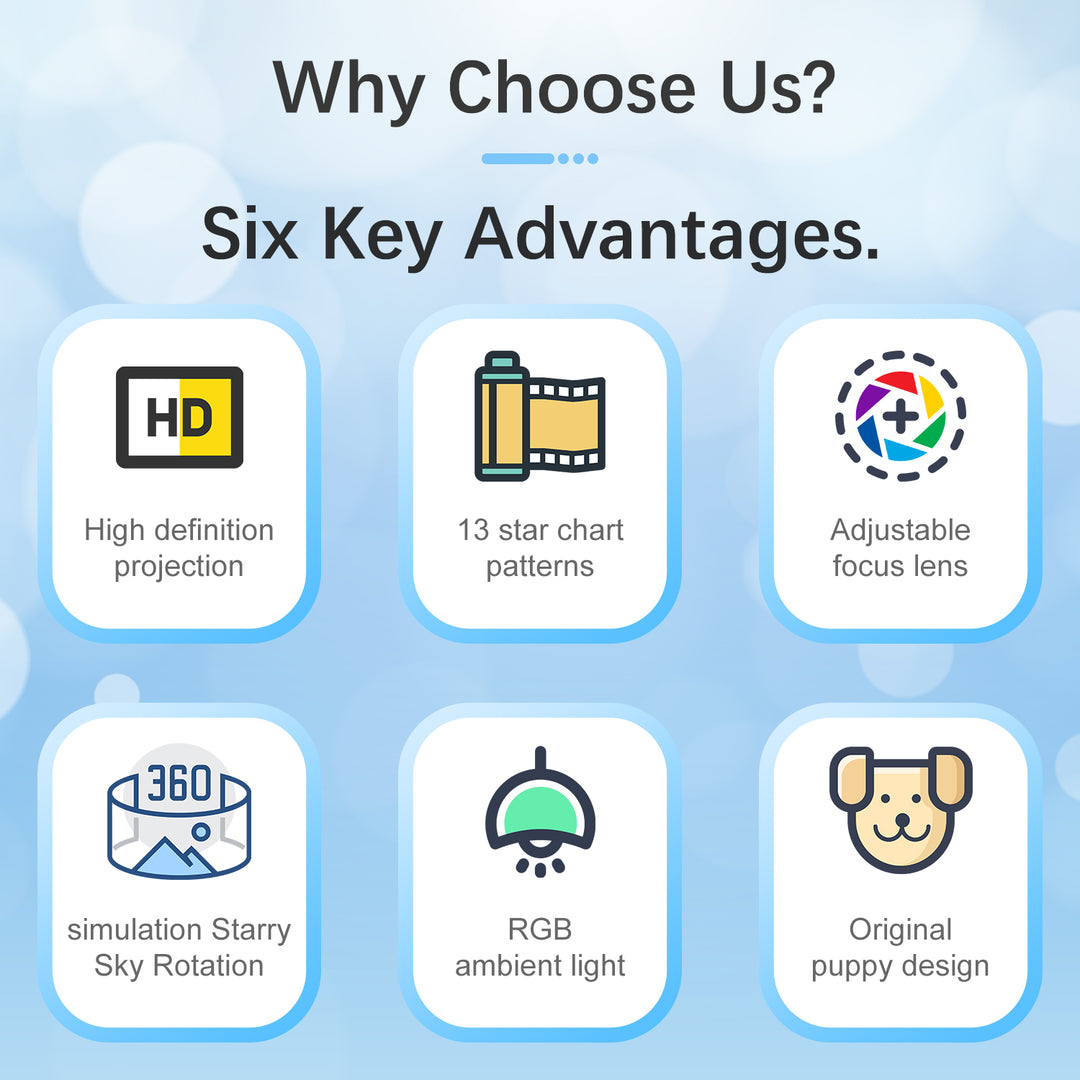 Projektor nabízí 15 uklidňujících melodií: zpěv ptáků, zvuky hmyzu, blesky, padající listí, mořské vlny, tekoucí voda, kvákání žab, zvonkohra ve větru, podzimní atmosféra, déšť, praskání ohně, bílý šum, ukolébavka 1, ukolébavka 2, ukolébavka 3.