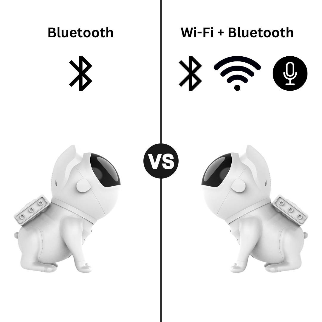 Obě verze projektoru ve tvaru vesmírného psa promítají hvězdné nebe a mlhoviny, přehrávají relaxační zvuky, umožňují připojení přes Bluetooth a nabízí dálkové ovládání. Klíčový rozdíl je v možnostech připojení a ovládání: