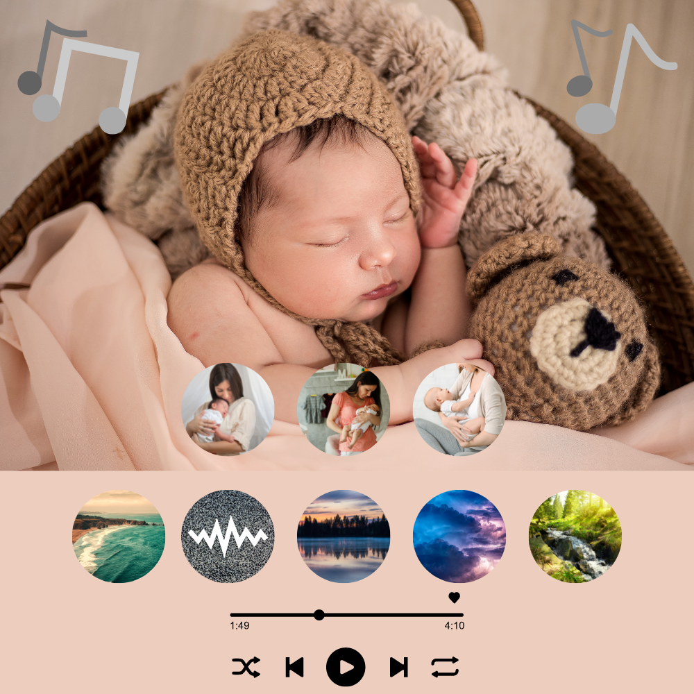 • 8 uklidňujících zvuků: oceán, bílý šum, déšť, bouřka, potok, letní noc, 3 ukolébavky.
