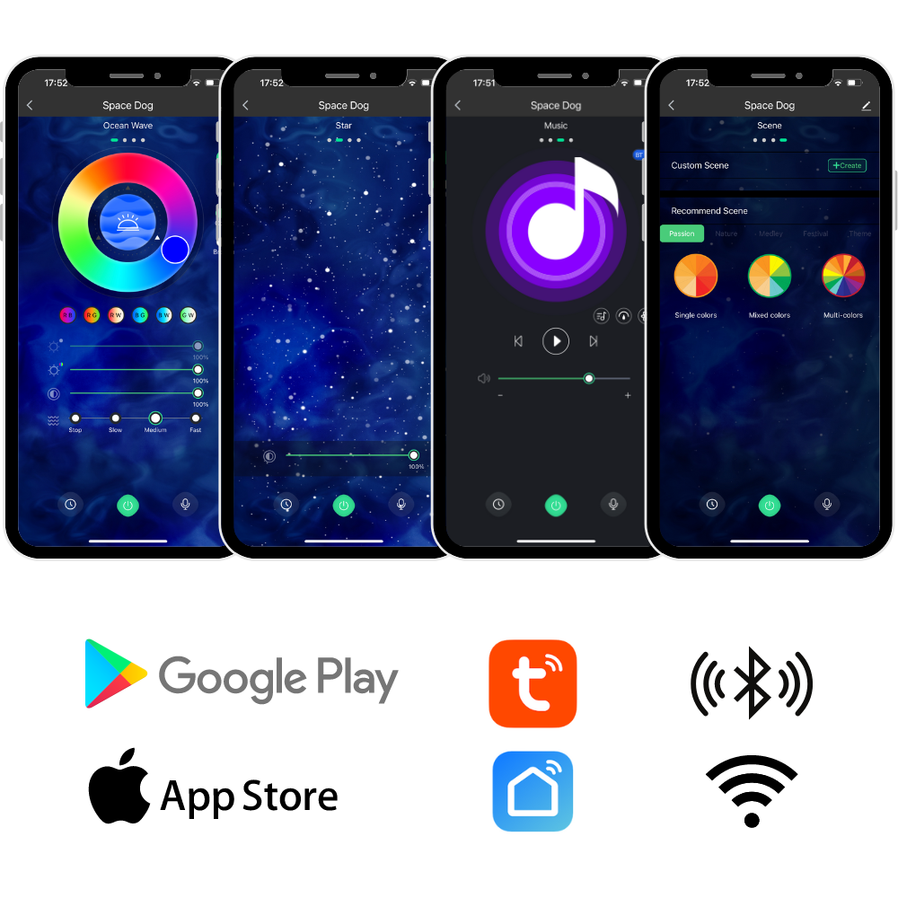 SPACE DOG je projektor noční oblohy a vesmírné mlhoviny v podobě vesmírného psa, se kterým můžete proměnit jakýkoliv prostor v galaxii plnou hvězd. Projektor nabízí několik možností ovládání, lze ho ovládat pomocí dálkového ovládání, vesmírného baťůžku umístěného přímo na projektoru, nebo pomocí mobilní aplikace.