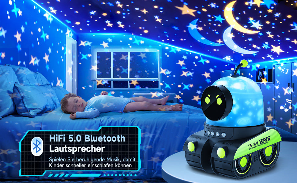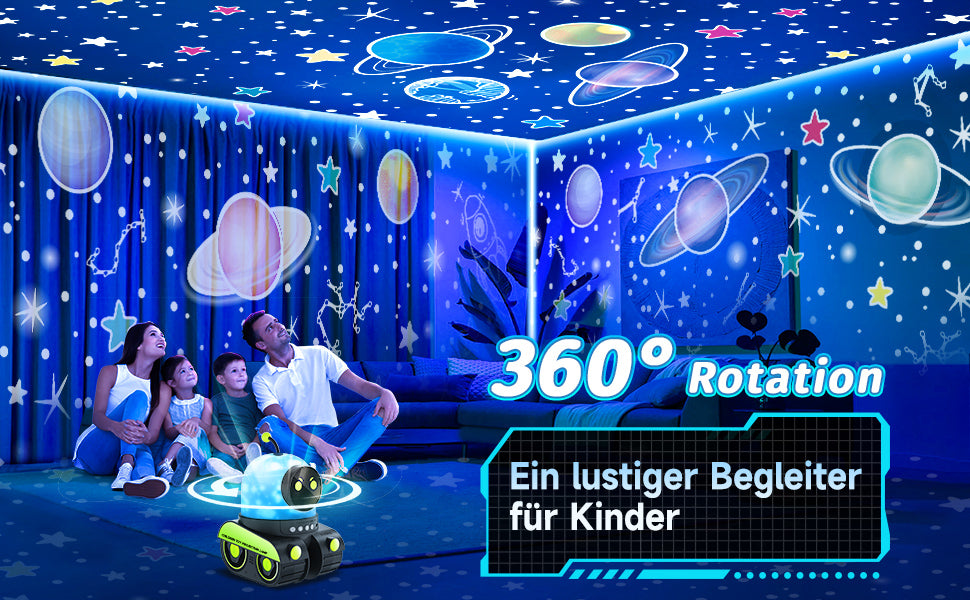 • 12 projekčních motivů: Děti si mohou vybrat z široké škály motivů, jako jsou hvězdy, měsíc, dinosauři, astronauti a další, které promítají magické obrazy na stěny a strop.