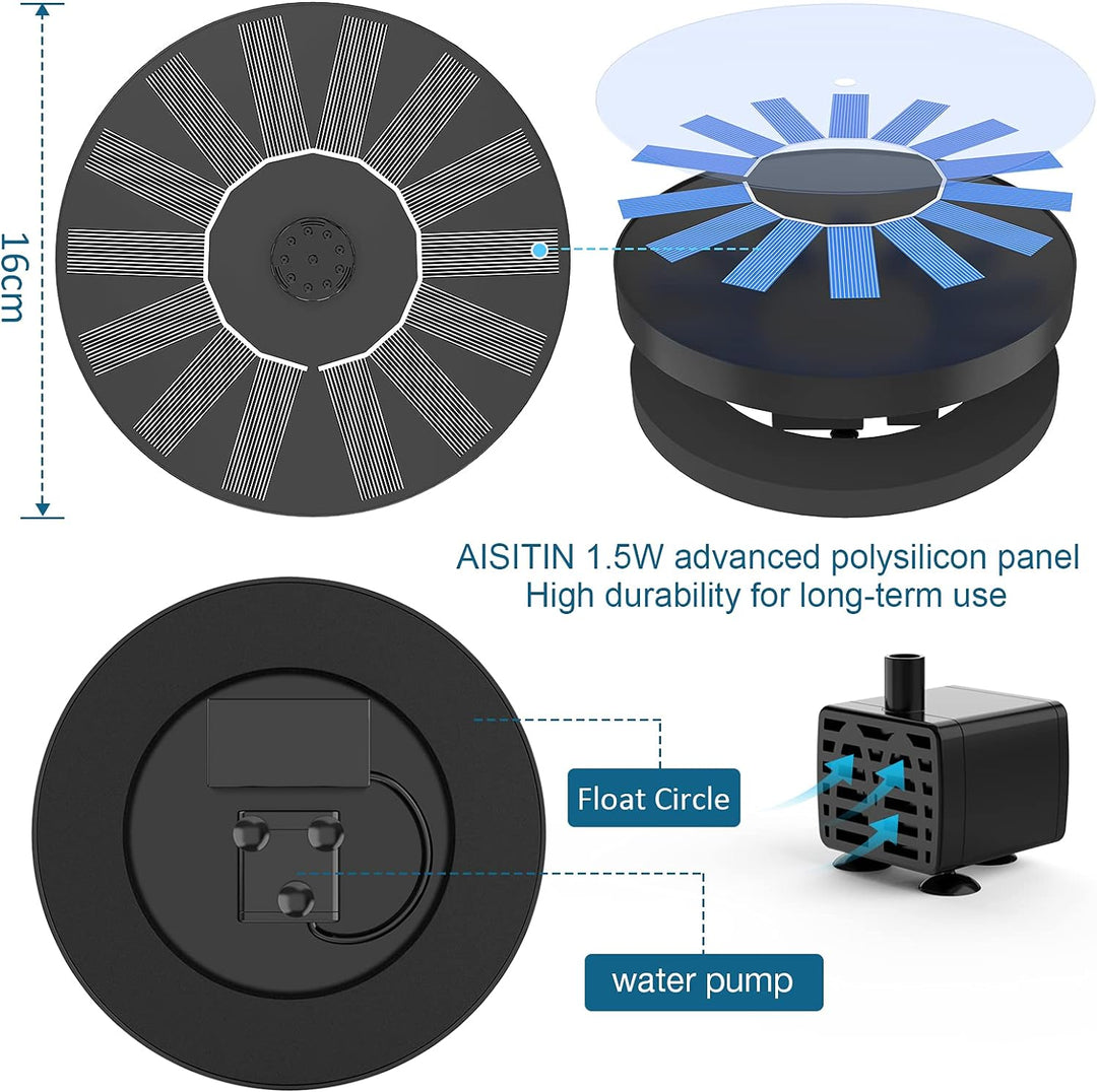 Užijte si nádheru a klid plovoucí solární fontány ve své zahradě, bazénu či jezírku. Tato ekologická fontána je vybavena pokročilým 1,5W polysilikonovým panelem, který efektivně využívá sluneční energii k provozu. Snadno se instaluje, automaticky se zapíná a vypíná podle slunečního svitu a nabízí různé tvary vodního proudu díky vyměnitelným tryskám. Bezdrátový design a víceúčelové využití dělají z této fontány ideální volbu pro každého, kdo chce přidat pohyb a zvuk tekoucí vody do svého venkovního prostoru, a zároveň šetřit energii a chránit životní prostředí.