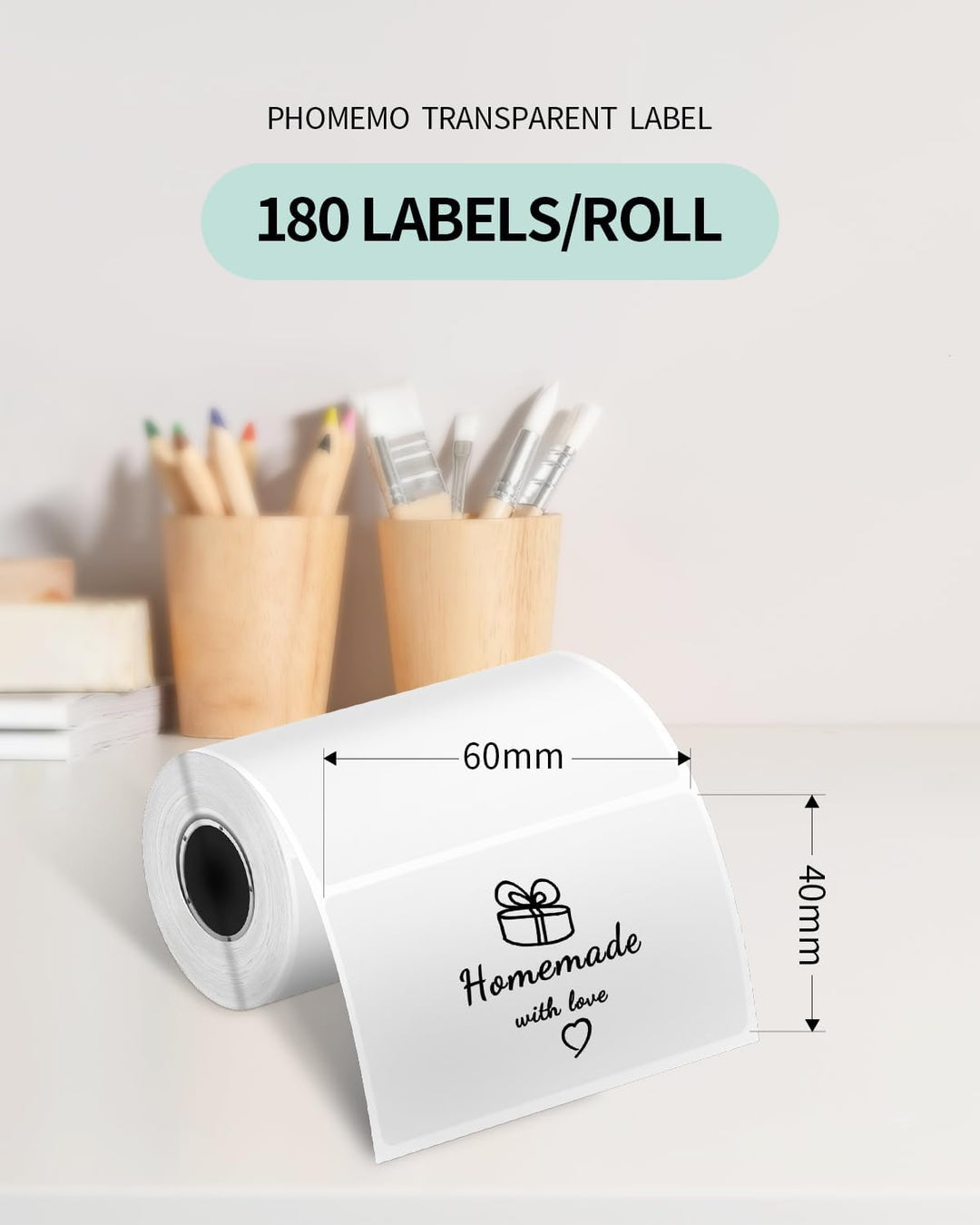 Phomemo transparentní termální štítky o rozměru 60 x 40 mm přinášejí profesionální a moderní řešení pro označování. Tyto průhledné samolepicí etikety jsou kompatibilní s tiskárnami Phomemo M220, M200 a M221 a umožňují tisk bez nutnosti inkoustu či toneru.