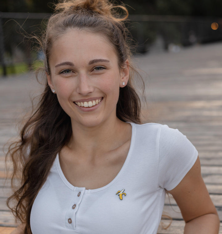 Ať už banán otevíráte z jakékoliv strany, jsme si jistí, že tenhle dokonalý mini banánek vám bude slušet za každou cenu. Žlutá barva a černé detaily dělají z této brože neodolatelný kousek, který přitáhne pozornost každého ve vašem okolí.