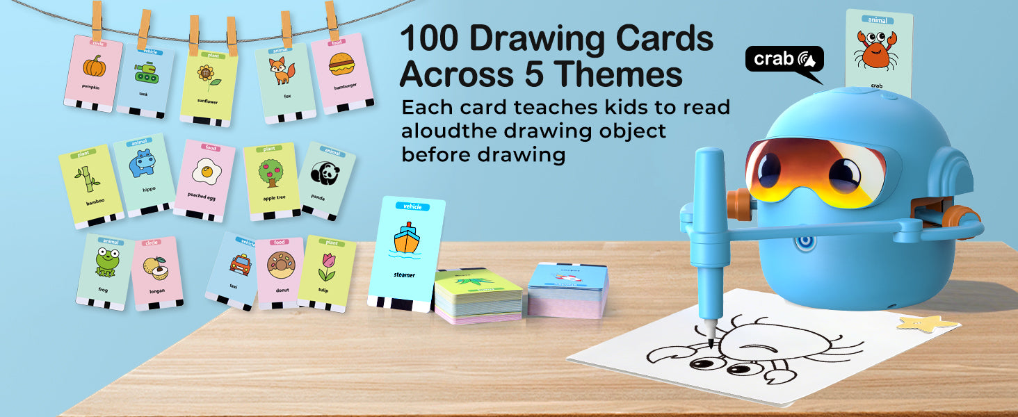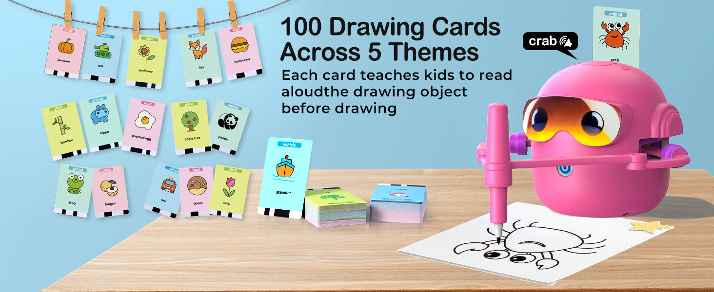 Součástí balení je 100 ilustrovaných karet, které dětem ukazují, jak nakreslit různé obrázky krok za krokem. Témata jsou přizpůsobena dětem – například zvířata, příroda, jídlo nebo každodenní předměty. Děti si tak hravou formou procvičí kreslení a postupně získají větší jistotu i samostatnost.