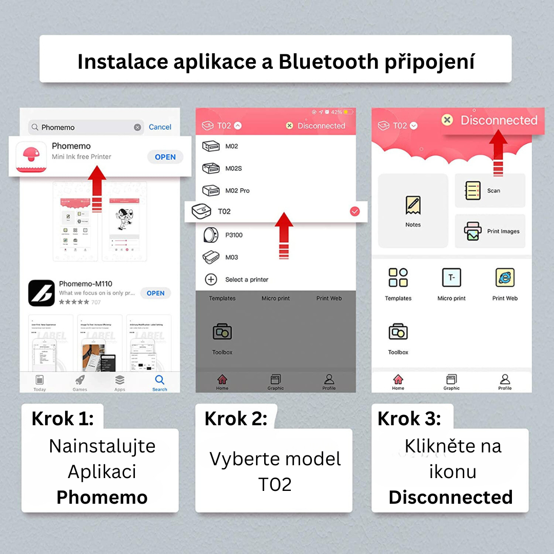Ke správnému používání tiskárny Phomemo T02 je potřeba si nainstalovat aplikaci Phomemo ve Vašem chytrém mobilu, nebo tabletu a připojit tiskárnu pomocí Bluetooth.
