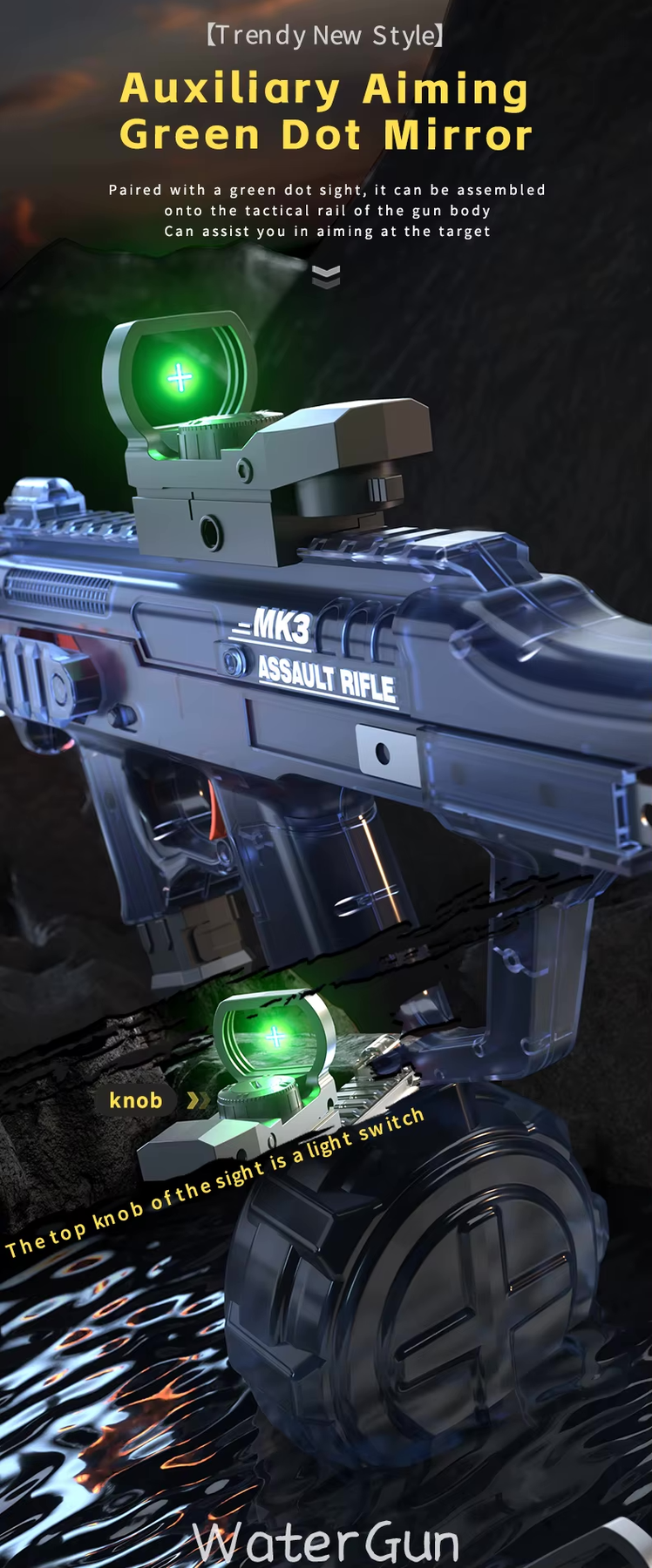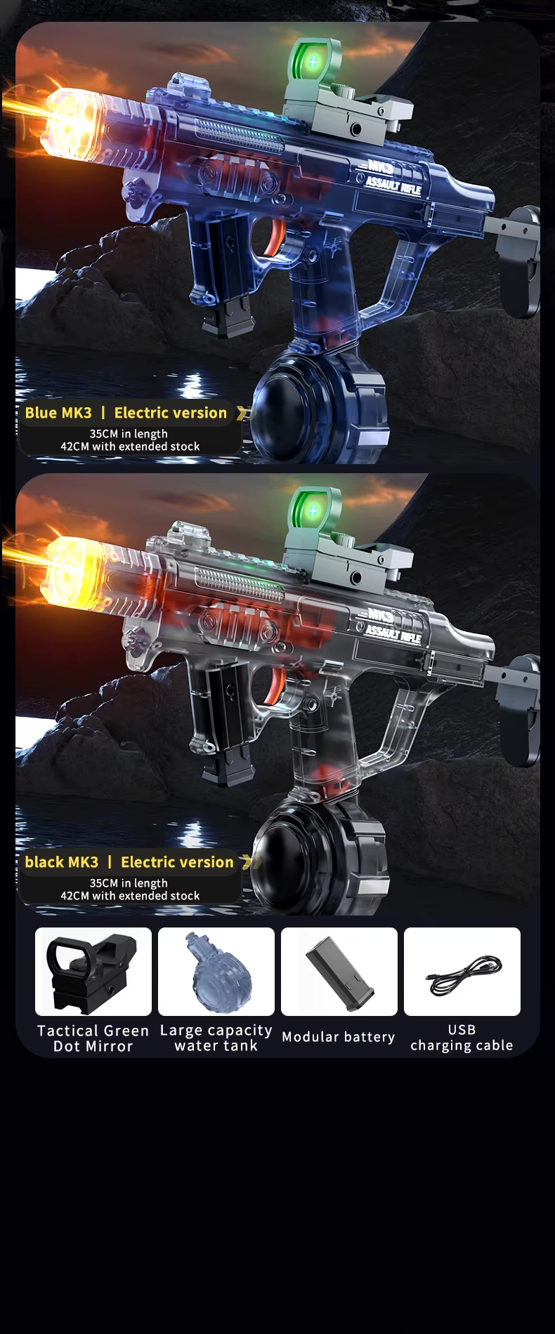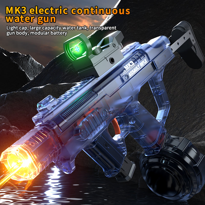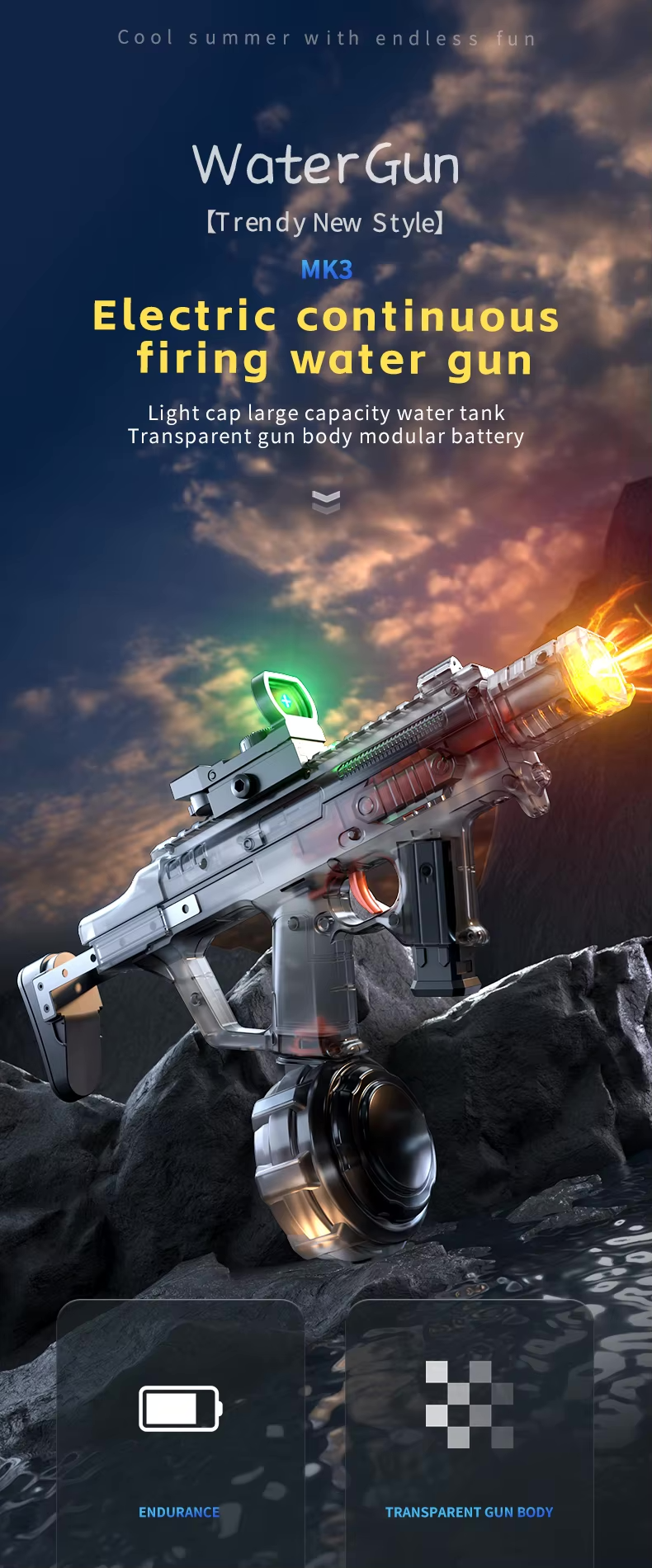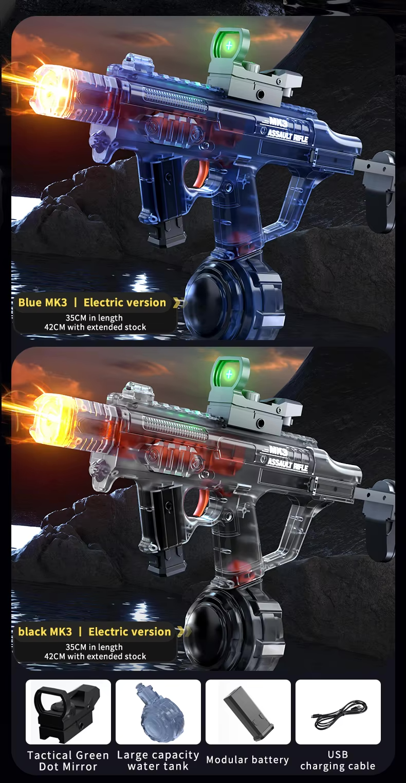 Zažijte novou generaci vodních soubojů s elektrickou vodní pistolí BATTLE MK3, která kombinuje moderní design, automatickou střelbu a efektní světelné prvky. Tento model je navržen pro všechny milovníky akční zábavy, kteří chtějí posunout klasické vodní pistole na úplně novou úroveň.