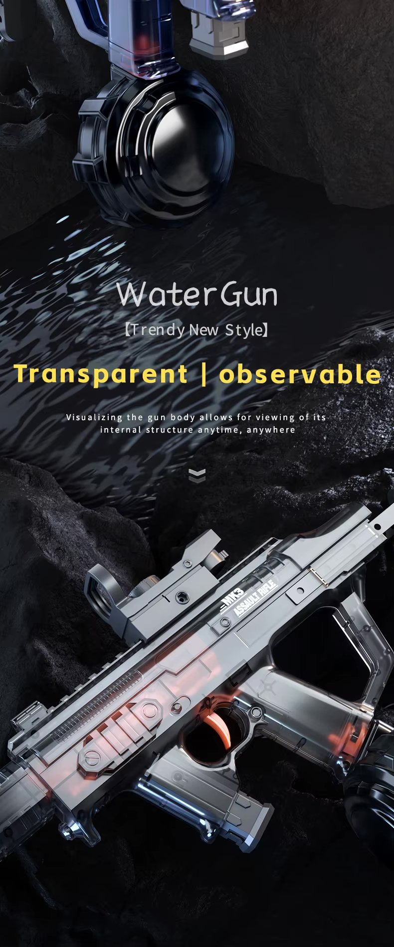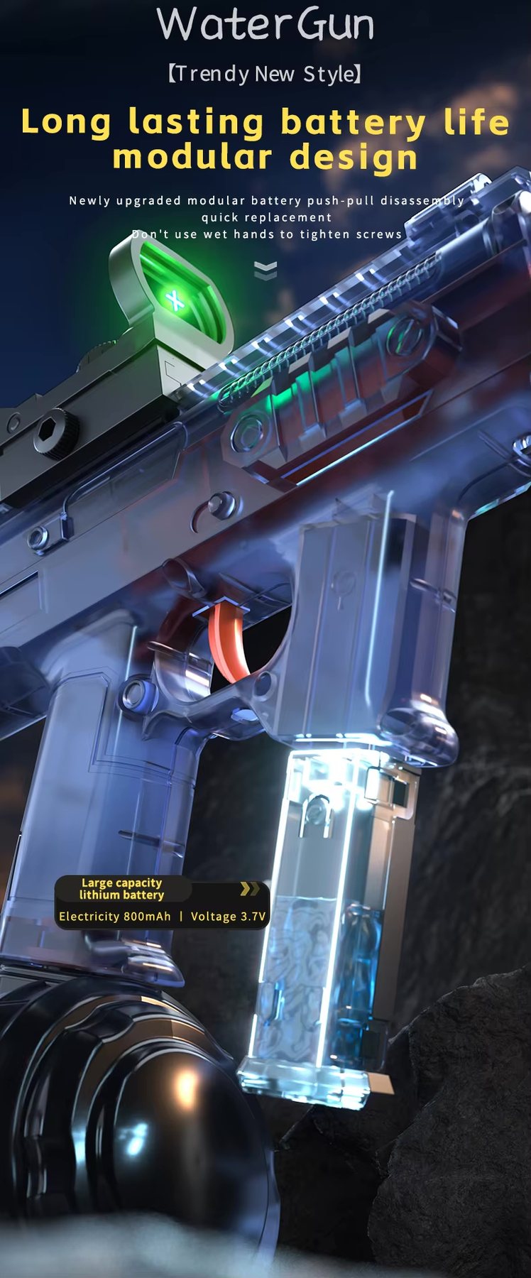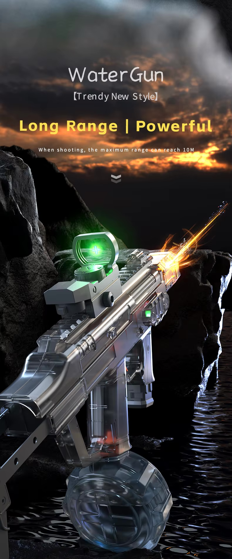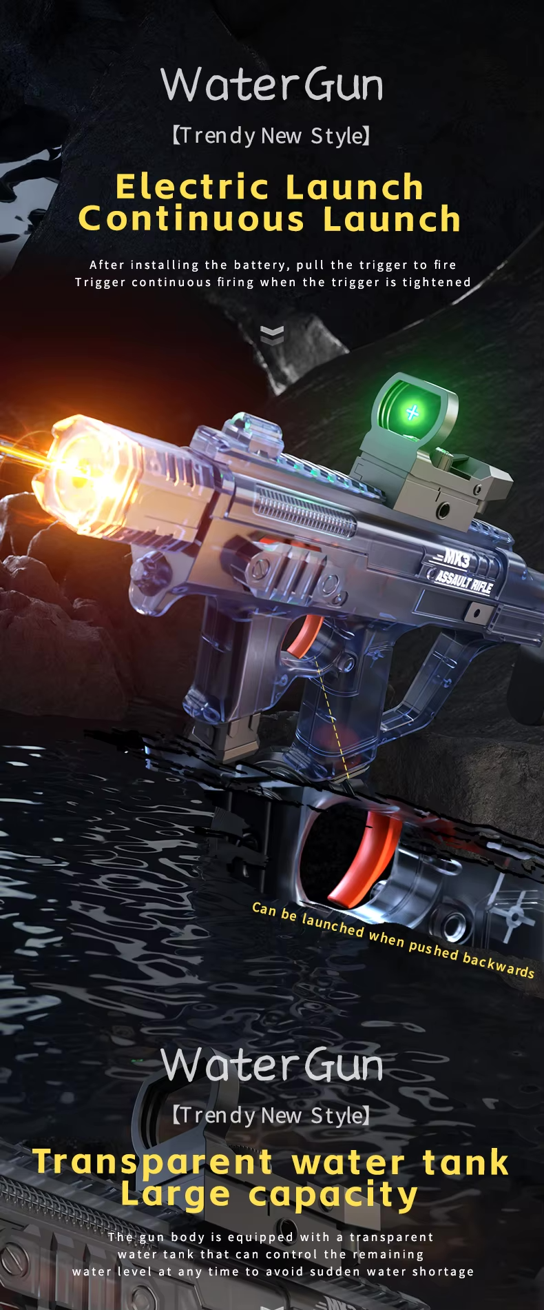 Díky elektrickému mechanismu odpadá ruční pumpování, takže si můžete užívat nepřetržitou střelbu pouhým stisknutím spouště. Pistole navíc nabízí transparentní konstrukci, která umožňuje sledovat hladinu vody i vnitřní mechaniku zařízení. Kombinace výkonu, stylu a praktických funkcí dělá z tohoto modelu ideální zbraň pro letní vodní bitvy.