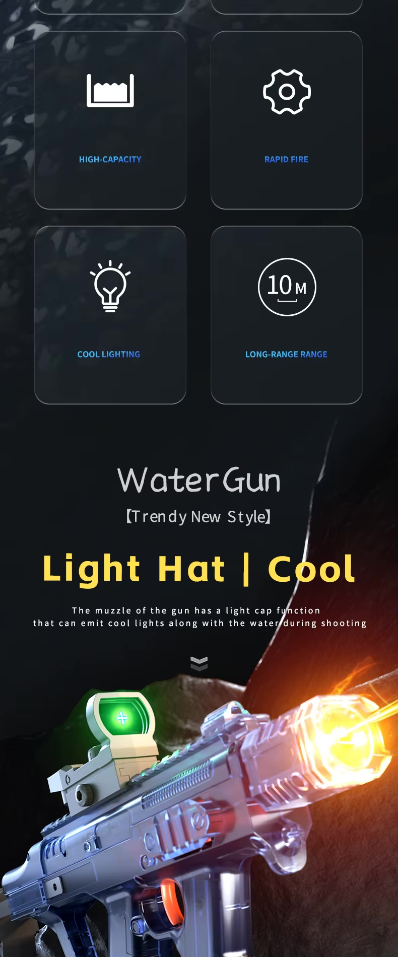 Jedním z nejvýraznějších prvků této vodní pistole je světelný modul umístěný na hlavni. Při střelbě vytváří atraktivní světelné efekty, které dodávají celé hře dynamičtější atmosféru. Pistole tak vypadá skvěle nejen ve dne, ale i při večerní zábavě.