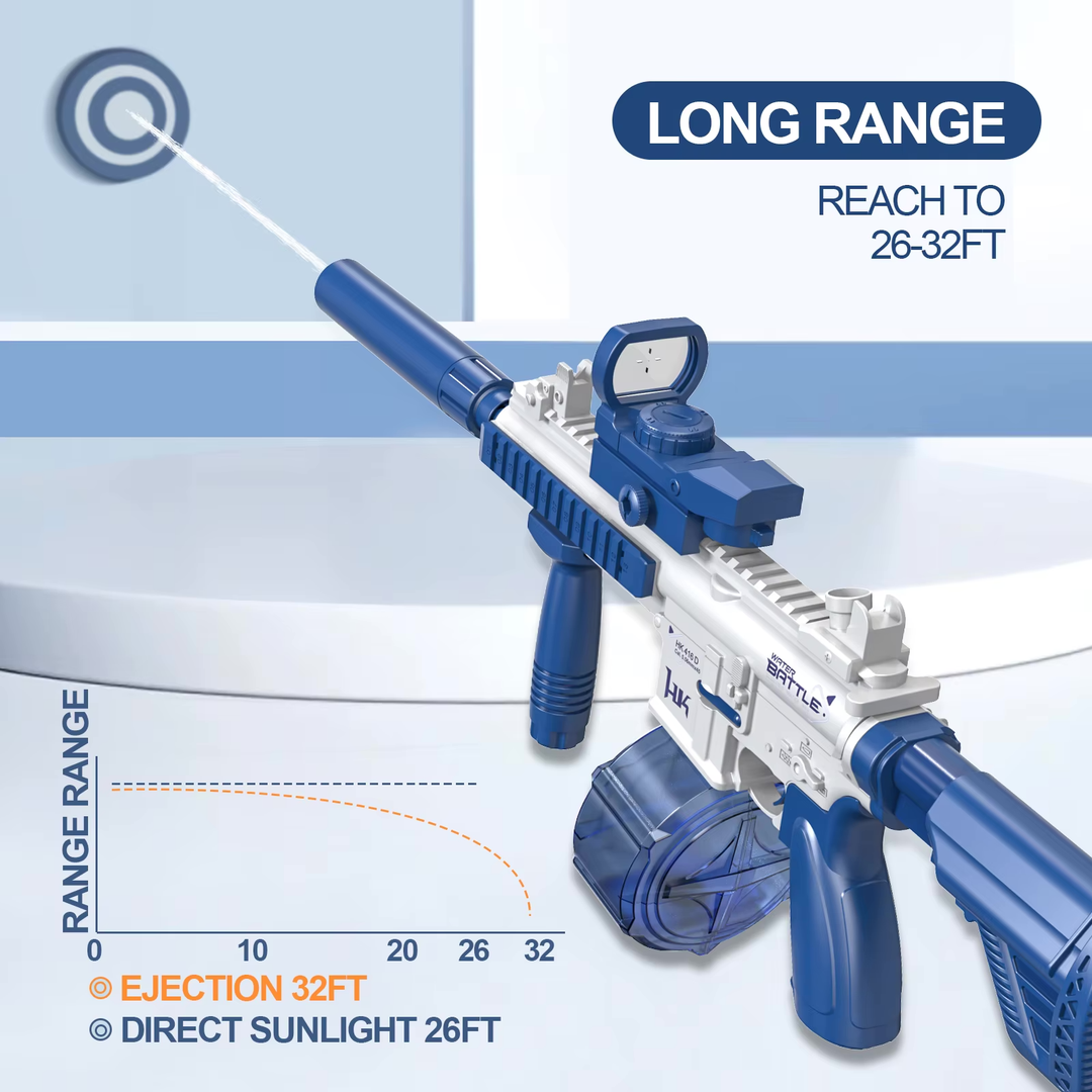 Stačí stisknout spoušť a pistole začne sama střílet silný proud vody až do vzdálenosti 10 metrů. Děti si s ní snadno poradí a užijí si maximální zábavu bez složitého ovládání.