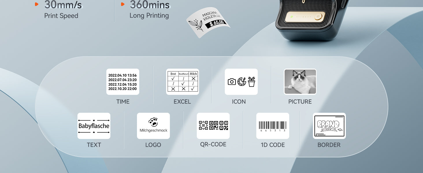 Tiskárna umožňuje tisk štítků v rozmezí šířek od 20 do 50 mm. Tiskne text, obrázky, QR kódy a čárové kódy, což ji činí vhodnou pro produktové, adresní, cenové, ingredienční či šperkové štítky.