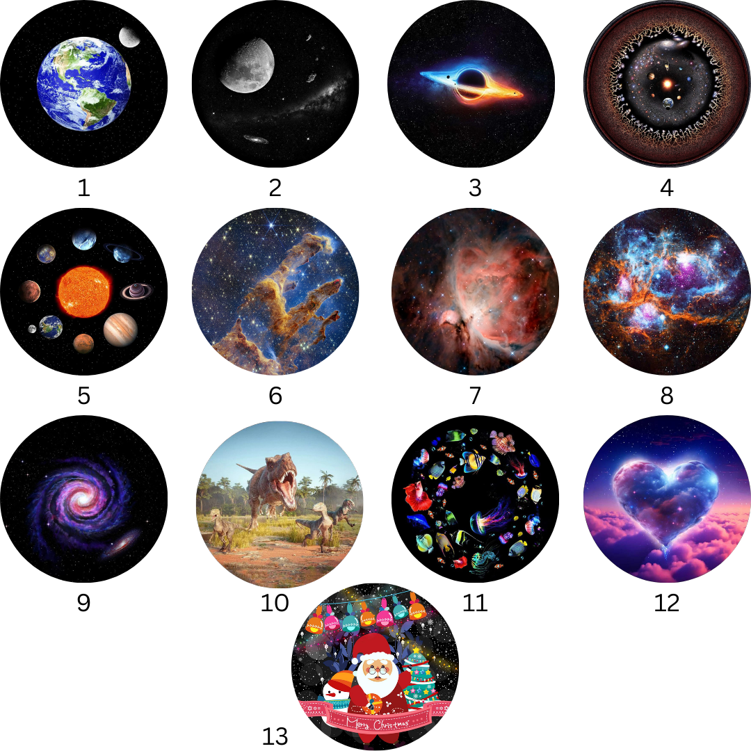 Součástí je 13 kazet se snímky ve 4K kvalitě. Najdete mezi nimi realistické pohledy na vesmír (Země, Měsíc, Sluneční soustava, mlhoviny, galaxie), ale i speciální motivy jako dinosauři, mořský svět, Vánoce nebo Den svatého Valentýna.