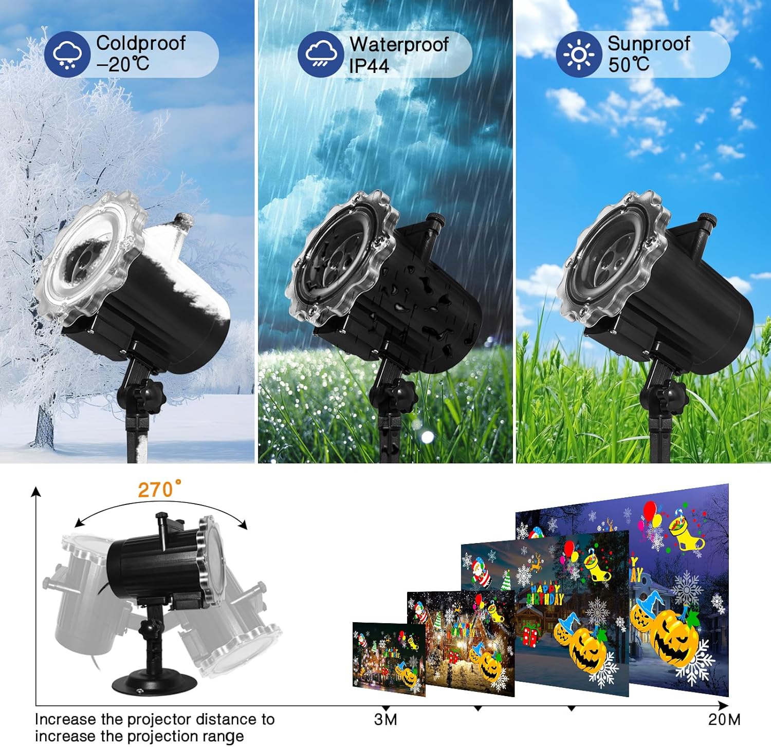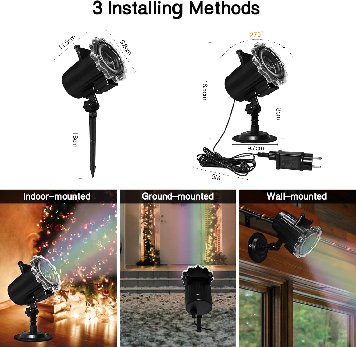 Tento univerzální projektor MOSSNDAR přináší působivé světelné efekty pro každou příležitost – od Halloweenu přes Vánoce až po narozeninové oslavy. Díky 16 výměnným HD diapozitivům se 64 motivy jednoduše promění fasáda vašeho domu, garáž nebo zahrada v tematickou podívanou plnou barev a pohybu.