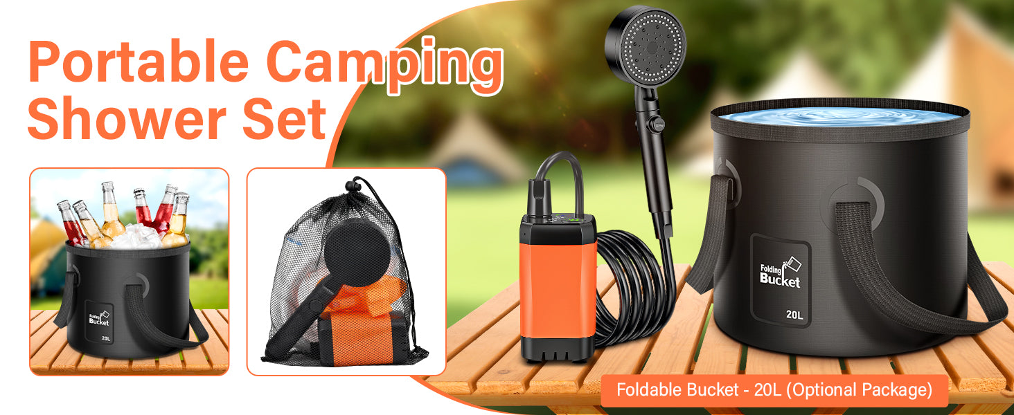 Přenosná kempingová sprcha s čerpadlem, LCD displejem a skládacím kbelíkem