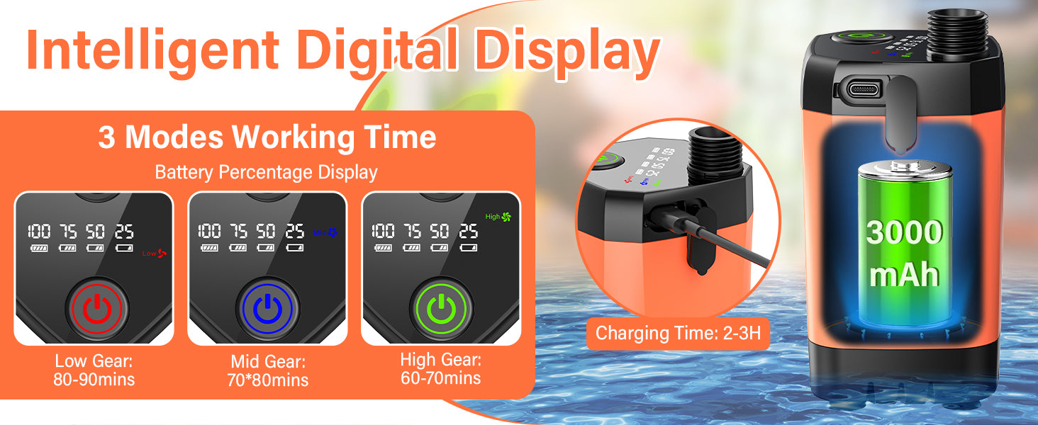 Tato přenosná sprcha je vybavena vestavěnou 3000mAh lithium-iontovou baterií, která zajišťuje až 90 minut provozu v úsporném režimu. Na výběr máš ze tří nastavitelných režimů průtoku – vysoký (60–70 min), střední (70–80 min) a nízký (80–90 min) – podle potřeby a situace. Nabíjení trvá pouze 2–3 hodiny díky modernímu USB-C konektoru.