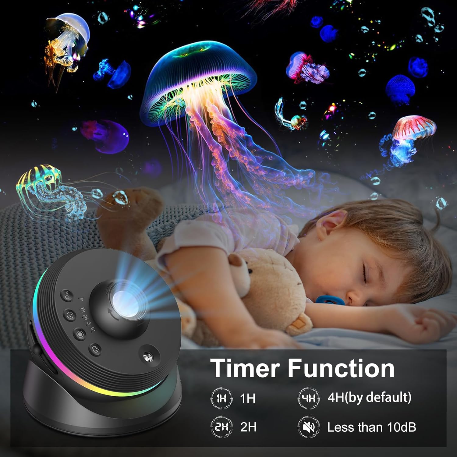 Ano, projektor je bezpečný a díky funkci časovače se sám po určité době vypne. Je ideální jako uklidňující večerní rituál před spaním.