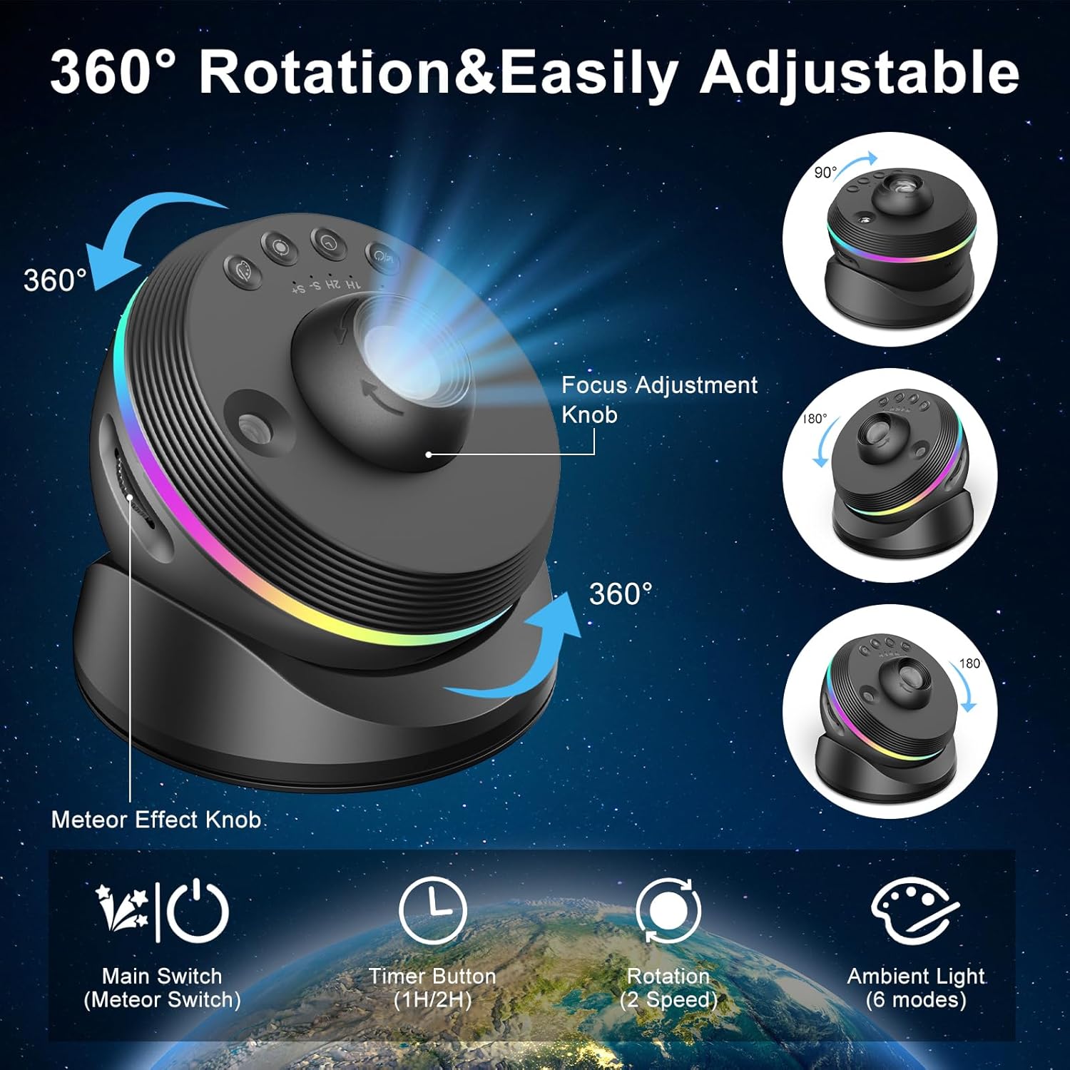 Objevte novou úroveň projekce s projektorem galaxie 6. generace, který promění každý prostor v fascinující vesmír. Nabízí realistickou simulaci meteoritu, rotující projekci ve 2 rychlostech a 13 kazet se snímky ve 4K kvalitě. Nově je vybaven vylepšeným stojanem s 360° nastavením, díky kterému snadno nasměrujete projekci přesně tam, kam potřebujete. Nechybí ani ambientní osvětlení, časovač pro automatické vypnutí a jednoduché dotykové ovládání pro maximální pohodlí při používání.